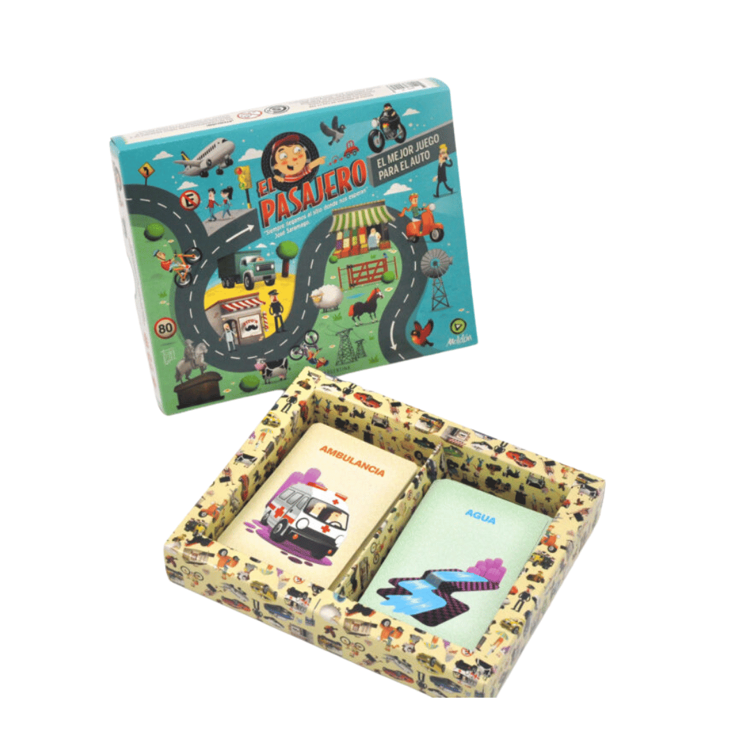 El Pasajero es el juego perfecto para tener en la guantera del auto. Consiste en dos mazos de 40 cartas, uno para la ruta y otro para la ciudad, con ilustraciones que los chicos deben encontrar mirando a través de la ventana. Se puede jugar solo, en equipos, o entre todos los pasajeros. El mejor antídoto para los viajes largos y el “¡¿cuánto falta para llegar?!”.